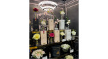 и вид. Композиция помещена в прозрачную, элегантную вазу с золотой эмблемой.